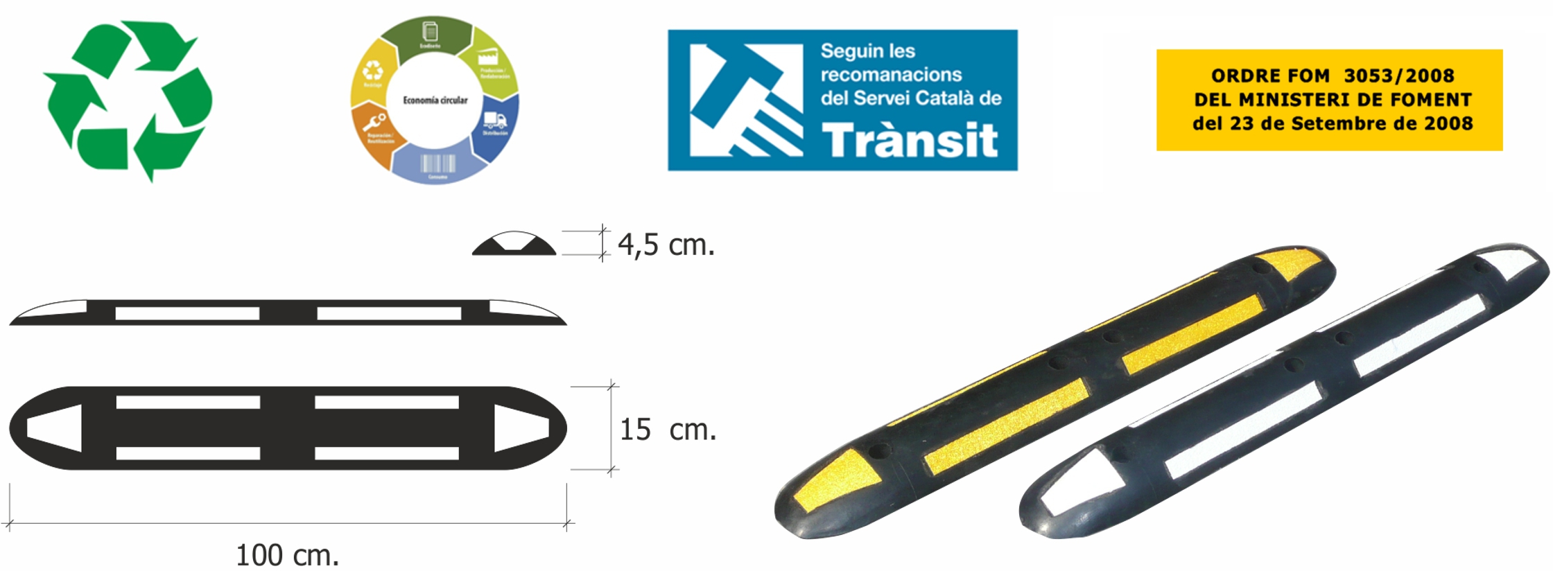 Lane separators 10 cm. high and 100 cm long, smooth edges with a reflective surface of 650 cm2 can incorporate reflective bands N II detachable traffic post, ideal for placing inclined with respect to the axis of the road and also in row.
